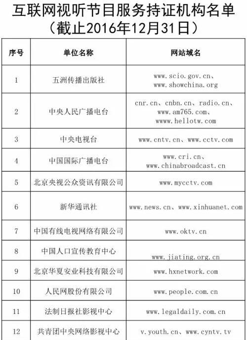 去年,國家新聞出版廣電總局公布《互聯(lián)網(wǎng)視聽節(jié)目服務(wù)持證機(jī)構(gòu)名單》(截至2016年5月31日),《名單》顯示持證機(jī)構(gòu)共588個,相比上一份(截至2014年3月5日)發(fā)布的數(shù)據(jù)持證機(jī)構(gòu)減少了25家。今年與上一次(2016年5月31日)公布的版本數(shù)量一致。