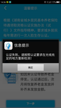 2) 如果檢測時,未按要求完成動作,系統(tǒng)將提示“人臉檢測失敗”,請按要求在光線充足的地方,再重新檢測。