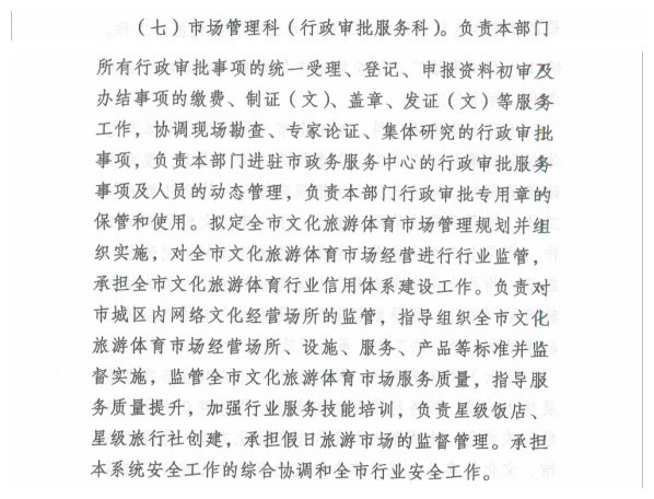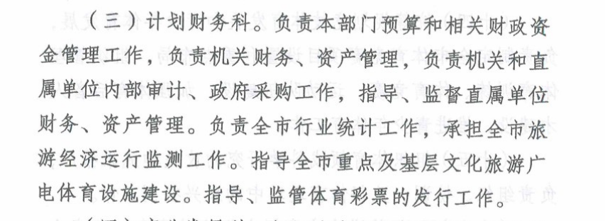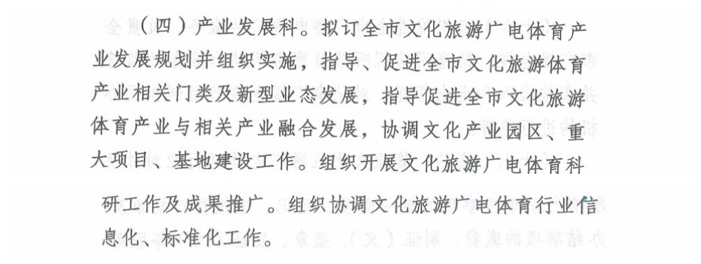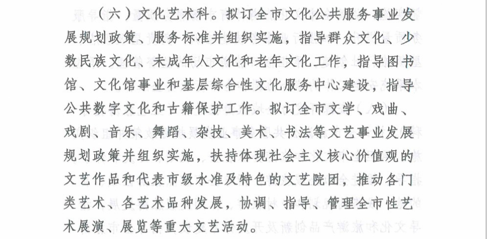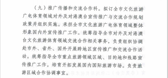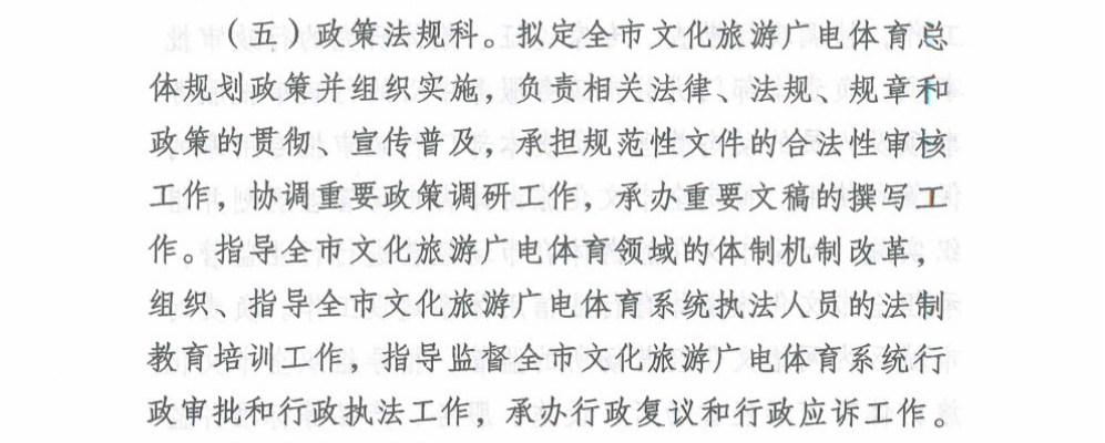 (一)貫徹黨和國家有關(guān)文化、旅游、廣播電視、體育工作方針、政策和法律、法規(guī),擬訂全市文化、旅游、廣播電視、體育事業(yè)發(fā)展規(guī)劃并指導(dǎo)實施,指導(dǎo)、推進全市文化、旅游、廣播電視、體育、文物領(lǐng)域體制機制創(chuàng)新;。。。
