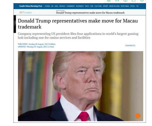 《新聞周刊》稱(chēng),特朗普對(duì)澳門(mén)的興趣至少已經(jīng)十年了。2006年,一家名為“特朗普有限公司”(Trump Companhia Limitada)的餐飲公司在澳門(mén)注冊(cè)成立。而2006年之后,特朗普本人要求在澳門(mén)申請(qǐng)注冊(cè)“唐納德·特朗普”、“特朗普大廈”及“特朗普國(guó)際酒店”等三個(gè)商標(biāo),2012年獲澳門(mén)特區(qū)政府經(jīng)濟(jì)局批準(zhǔn)。隨后,特朗普起訴前述“特朗普有限公司”,并于2016年5月贏得這場(chǎng)官司,澳門(mén)特區(qū)法院最終判決,這家公司不得再使用“特朗普”商標(biāo)。