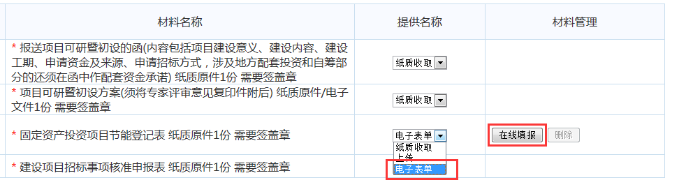2) 進入事項的申報頁面,在申報材料中的“提供名稱”列中選擇“電子表單”,點擊“在線填報”,即可進入在線智能表單的填寫頁面