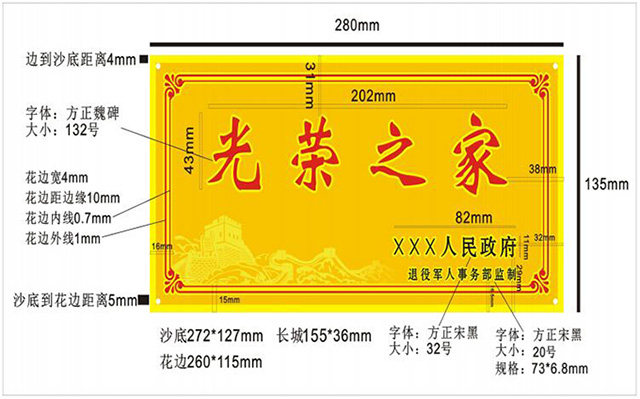 光榮牌(式樣圖附后)材質(zhì)為鈦金牌,底色為金黃色、沙底鍍金;規(guī)格為280毫米×135毫米,厚度1毫米;“光榮之家”字樣為紅色套亮金邊,方正魏碑簡(jiǎn)體132號(hào)字,四個(gè)字規(guī)格為202毫米×43毫米,距上邊31毫米,左右居中;“×××人民政府”字樣為方正宋體黑色32號(hào)簡(jiǎn)體字,規(guī)格為82毫米×11毫米,距下邊29毫米,距右邊32毫米;左下角配長(zhǎng)城圖案、亮金色,規(guī)格為155毫米×36毫米,距下邊15毫米,距左邊16毫米;紅色花邊寬4毫米,距邊緣10毫米,花邊內(nèi)線粗0.7毫米,花邊外線粗1毫米。右下花邊內(nèi)“退役軍人事務(wù)部監(jiān)制”字樣為方正宋體黑色20號(hào)字,規(guī)格為73毫米×6.8毫米,距下邊16.5毫米,與“×××人民政府”右端對(duì)齊。
