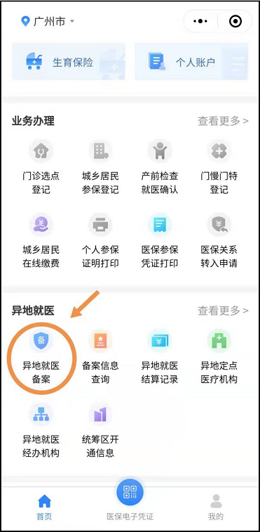 第一步:微信搜索“粵醫(yī)保”小程序,按提示操作登錄,登錄成功之后,在“異地就醫(yī)”中點擊“異地就醫(yī)備案”小圖標進入操作頁面。