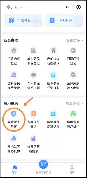 第一步:微信搜索“粵醫(yī)保”小程序,按提示操作登錄,登錄成功之后,在“異地就醫(yī)”中點擊“異地就醫(yī)備案”小圖標進入操作頁面。