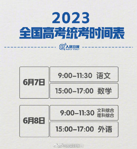 據(jù)教育部官網(wǎng):全國統(tǒng)考于6月7日開始舉行,具體科目考試時間安排為:6月7日9:00至11:30語文;15:00至17:00數(shù)學。6月8日9:00至11:30文科綜合/理科綜合;15:00至17:00外語,有外語聽力測試內容的應安排在外語筆試考試開始前進行。