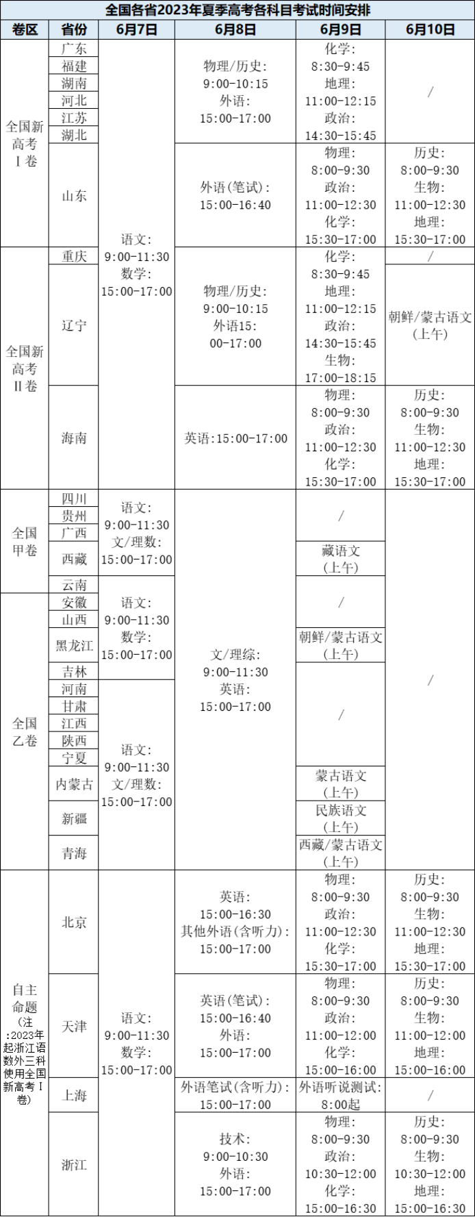 由于近年來各省的夏季高考時間都相對固定,因此老師為大家收集匯總 2023 年全國 31 省的夏季高考時間安排(預測版),最終請以官方公布為準。