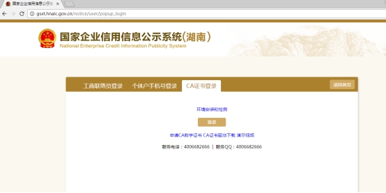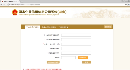 第一步:登陸年報系統(tǒng)。進入國家企業(yè)信用信息公示系統(tǒng)(湖南)(http://www.51gecaochuan.cn/shop/9695.html),選擇“企業(yè)信息填報”,進入登錄頁面,當前系統(tǒng)提供三種登錄方式: 工商聯(lián)絡員登錄、個體工商戶手機號登錄、CA證書登錄)。