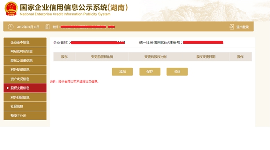 第十一步:點擊“添加”,填寫股權變更信息。點擊“保存”回到股權變更基本頁面,再點擊“保存”。