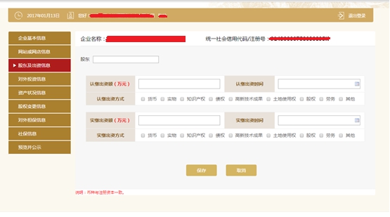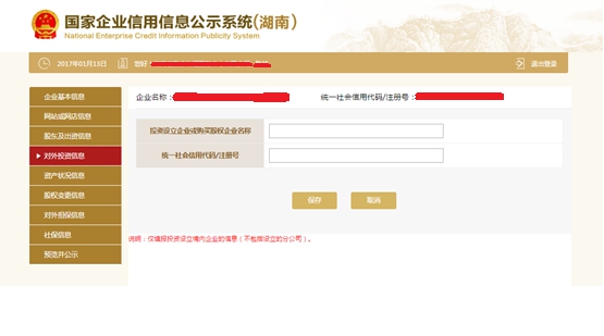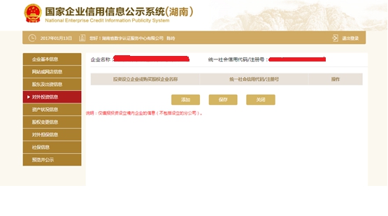 第十三步:點擊“添加”,填寫對外投資信息。點擊“保存”,回到填寫對外投資基本信息頁面,再點擊“保存”。