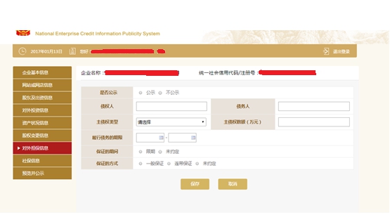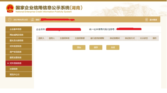 第十六步:點擊“添加”,填寫對外擔保信息。點擊“保存”,回到對外擔保信息基本頁面,再點擊“保存”。