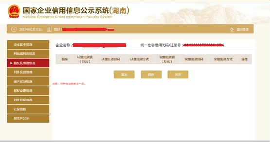 第七步:點擊“添加”,填寫股東及出資信息,點擊“保存”,回到股東及出資信息頁面,再點擊“保存”(注:股東的認繳出資額總和應等于注冊資本)。