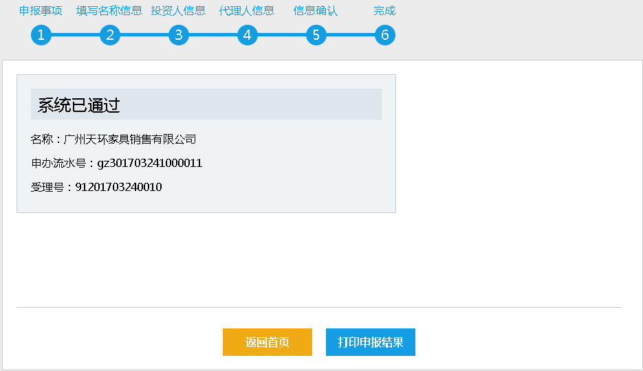 第六步:自動生成《企業(yè)名稱自主申報告知書》,申請人憑打印出來的《企業(yè)名稱自主申報告知書》到企業(yè)登記注冊窗口辦理企業(yè)登記。