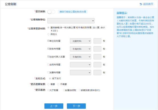 公章刻制環(huán)節(jié)可選擇是否在線辦理公章,如選擇不在線辦理,則需要自行前往公章刻制點辦理;如選擇在線辦理,則需要擇刻制單位、公章類型和材質(zhì)、是否需要正能量和領(lǐng)取公章方式,帶【*】提示的為必填項。