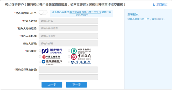 用戶可根據(jù)自身需求選擇是否需要預(yù)約,需要預(yù)約則需錄入相關(guān)預(yù)約人和開戶銀行網(wǎng)點信息,在執(zhí)照核發(fā)完成后,相關(guān)信息便會發(fā)送至銀行網(wǎng)點,銀行會聯(lián)系經(jīng)辦人進(jìn)行開戶辦理,目前支持中國農(nóng)業(yè)銀行、中國建設(shè)銀行、浦發(fā)銀行、中國銀行、交通銀行、中國工商銀行;選擇否,可以在企業(yè)開辦后通過“電子營業(yè)執(zhí)照銀行預(yù)開戶平臺”或銀行網(wǎng)點辦理開戶。