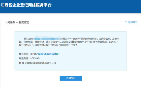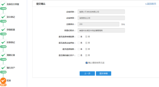 所有環(huán)節(jié)的相關(guān)信息錄入完成后點擊【提交審核】,提交后相關(guān)信息會首先發(fā)送至市場監(jiān)管部門進行審核,待執(zhí)照核發(fā)后,其他部門的業(yè)務(wù)信息會開始進行。