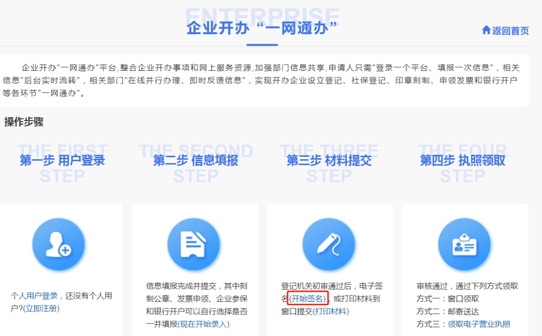 點擊首頁中業(yè)務(wù)導航下的【企業(yè)開辦“一網(wǎng)通辦”】—【開始簽名】