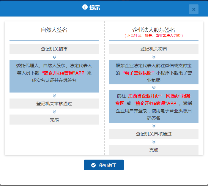 兩種方式可以隨時自由切換,舉例:如果你準備用方式一進行登記,材料打印給股東簽字,發(fā)現(xiàn)股東出國了,這個時候你可以下載“贛企開辦e窗通”APP直接進行電子簽名;如果你準備用方式二進行登記,但是有一個股東實名認證一直通過不了,這個時候也可以打印書式材料給股東手寫簽字。