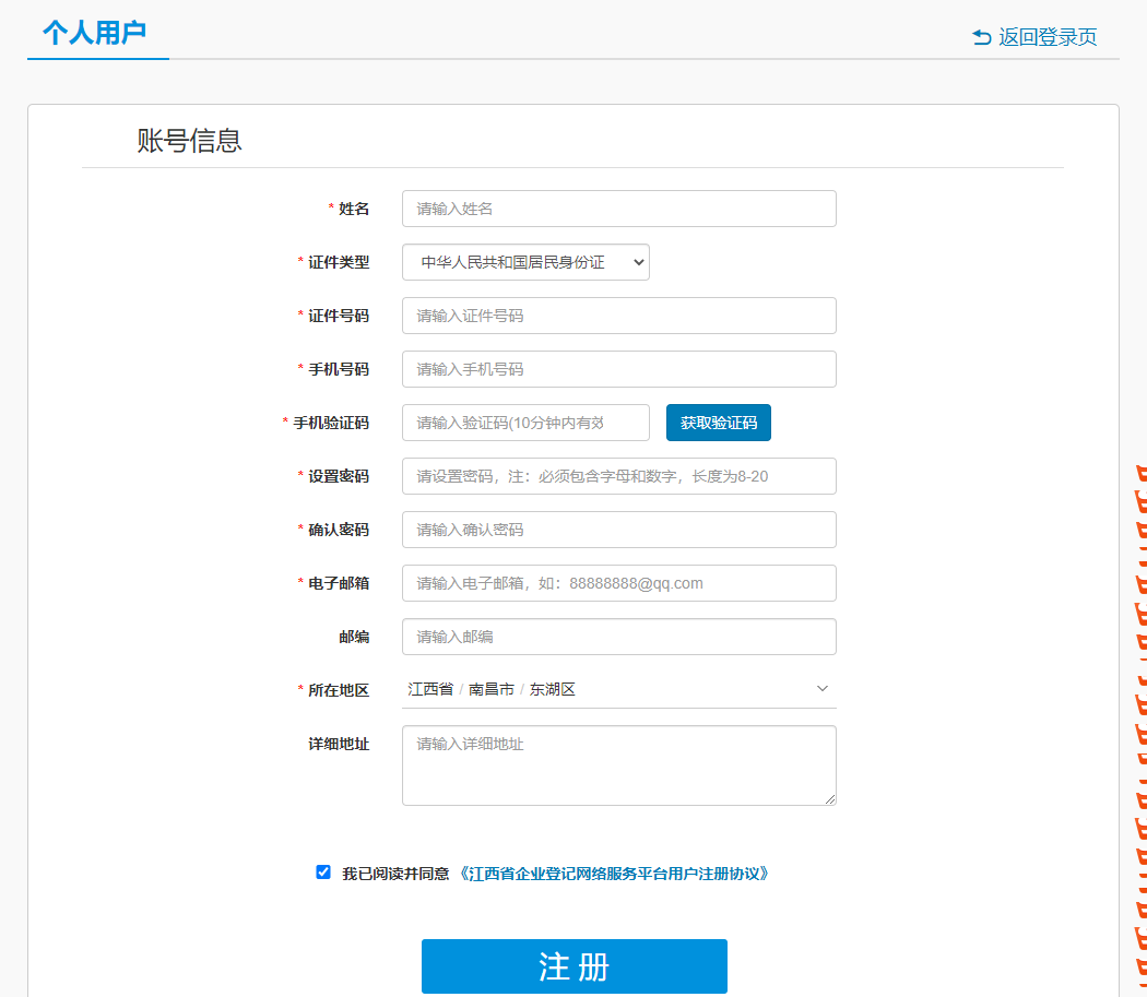 【個(gè)人用戶】:企業(yè)網(wǎng)上登記信用監(jiān)管業(yè)務(wù)通過(guò)個(gè)人用戶發(fā)起。注冊(cè)個(gè)人用戶請(qǐng)點(diǎn)擊【立即注冊(cè)】按鈕進(jìn)入個(gè)人用戶注冊(cè)頁(yè)面。在注冊(cè)頁(yè)面中錄入個(gè)人手機(jī)號(hào)碼、真實(shí)身份信息等資料,錄入完畢后,接收并輸入驗(yàn)證碼,點(diǎn)擊【立即注冊(cè)】按鈕,即可注冊(cè)個(gè)人用戶成功。個(gè)人用戶以手機(jī)號(hào)碼為用戶名。