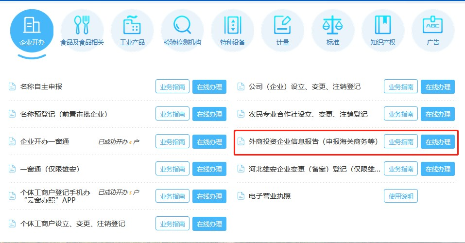 用戶訪問“河北省市場監(jiān)督管理局政務(wù)服務(wù)平臺”,點擊【企業(yè)開辦】→【外商投資企業(yè)】,如下圖: