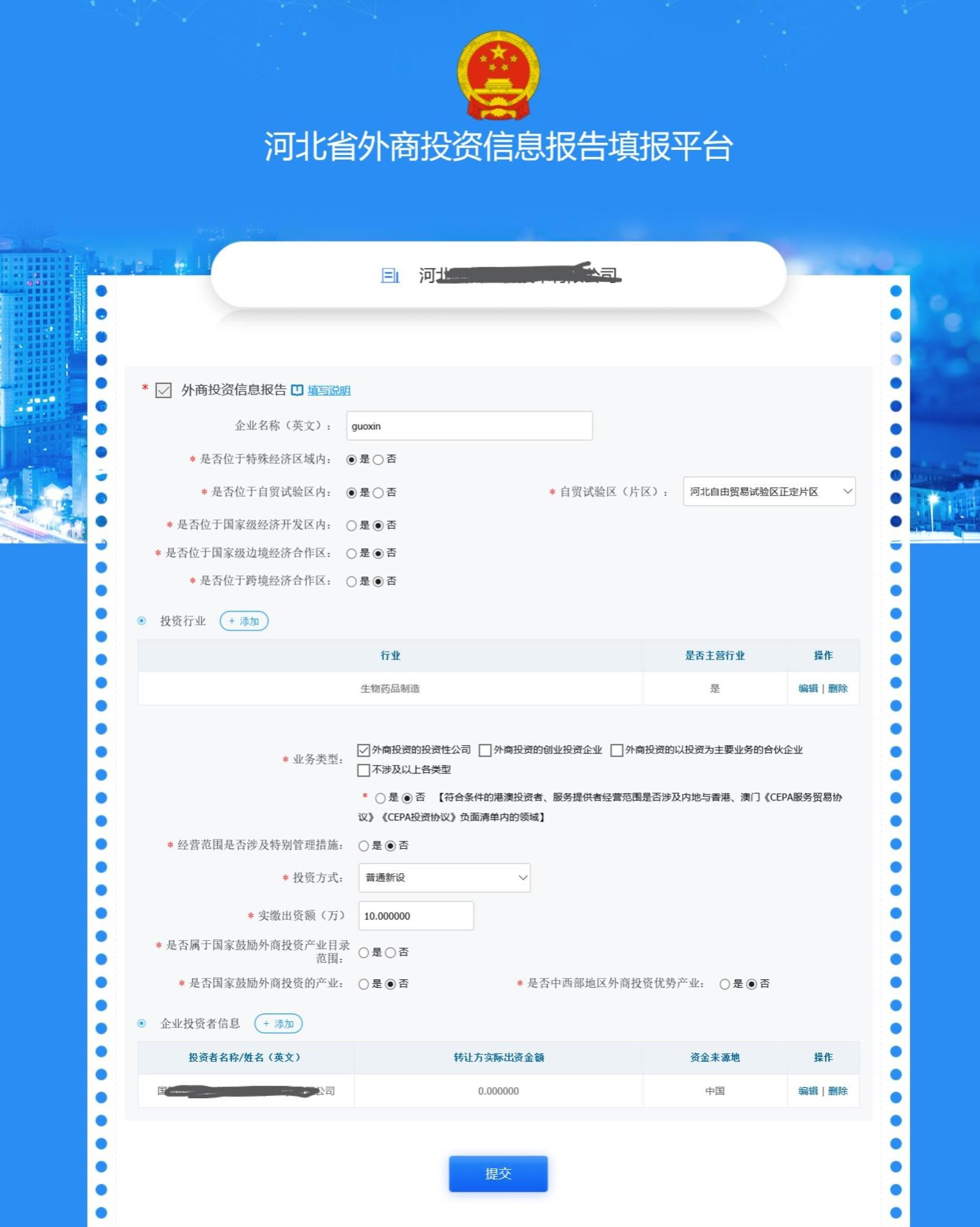 企業(yè)根據(jù)實際情況填寫完成外商投資企業(yè)信息報告之后,點擊“提交”按鈕,完成外資報告的填報。
