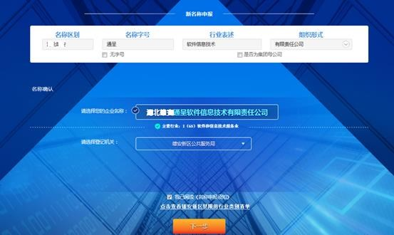 根據(jù)提示填寫企業(yè)名稱的“四段式”內(nèi)容,系統(tǒng)會(huì)進(jìn)行自動(dòng)比對(duì),顯示已有的相似企業(yè)名稱供申請(qǐng)人參考,申請(qǐng)人確定擬申請(qǐng)名稱,選擇登記機(jī)關(guān),勾選“我已閱讀《名稱申報(bào)須知》”,提交名稱申請(qǐng),系統(tǒng)會(huì)再次進(jìn)行名稱查重,查重通過后方可進(jìn)行下一步。申報(bào)通過不代表登記機(jī)關(guān)對(duì)于企業(yè)名稱的確認(rèn),具體以審核意見為準(zhǔn)。