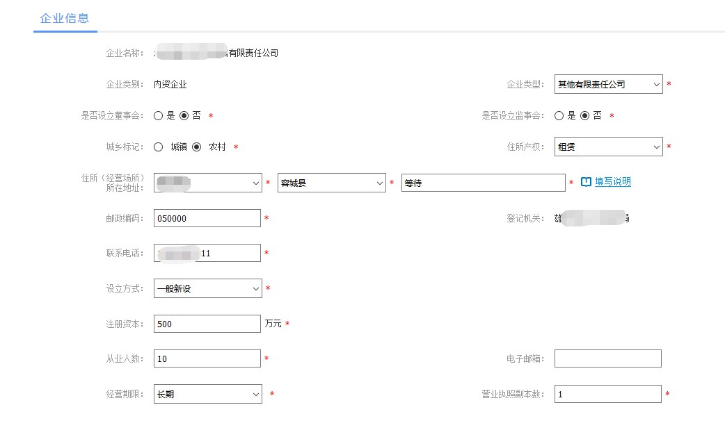 申請(qǐng)人根據(jù)系統(tǒng)提示依次填寫資料。首先指定代表或者委托代理人的信息會(huì)根據(jù)申請(qǐng)人的賬號(hào)信息自動(dòng)帶入。申請(qǐng)人需要手動(dòng)填寫擬設(shè)立企業(yè)信息、經(jīng)營(yíng)范圍、企業(yè)聯(lián)絡(luò)員信息,黨建信息。