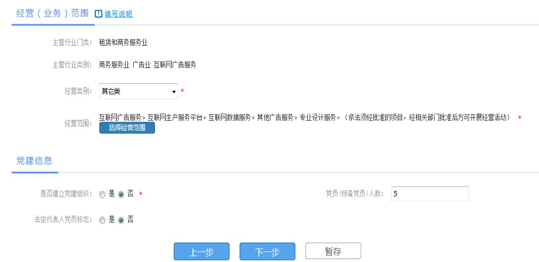 其中經(jīng)營(yíng)范圍的填寫需要點(diǎn)擊選擇經(jīng)營(yíng)范圍,系統(tǒng)會(huì)進(jìn)入到經(jīng)營(yíng)范圍填寫頁面,需要在條形框內(nèi)輸入經(jīng)營(yíng)范圍關(guān)鍵詞進(jìn)行選擇,但需要注意的是經(jīng)營(yíng)范圍第一項(xiàng)應(yīng)與主營(yíng)行業(yè)相匹配,否則不能進(jìn)行下一步。