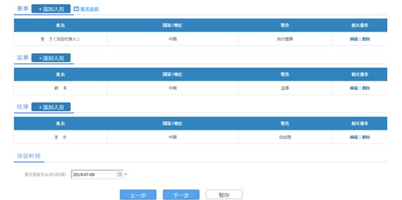 下一步,申報(bào)人填寫主要人員信息,包括董事、監(jiān)事、經(jīng)理等,并且法定代表人應(yīng)由董事長(zhǎng)、執(zhí)行董事,或者經(jīng)理擔(dān)任,在添加時(shí)選擇法人標(biāo)志。另外,監(jiān)事不得擔(dān)任其他職務(wù),包括董事、經(jīng)理、財(cái)務(wù)負(fù)責(zé)人。