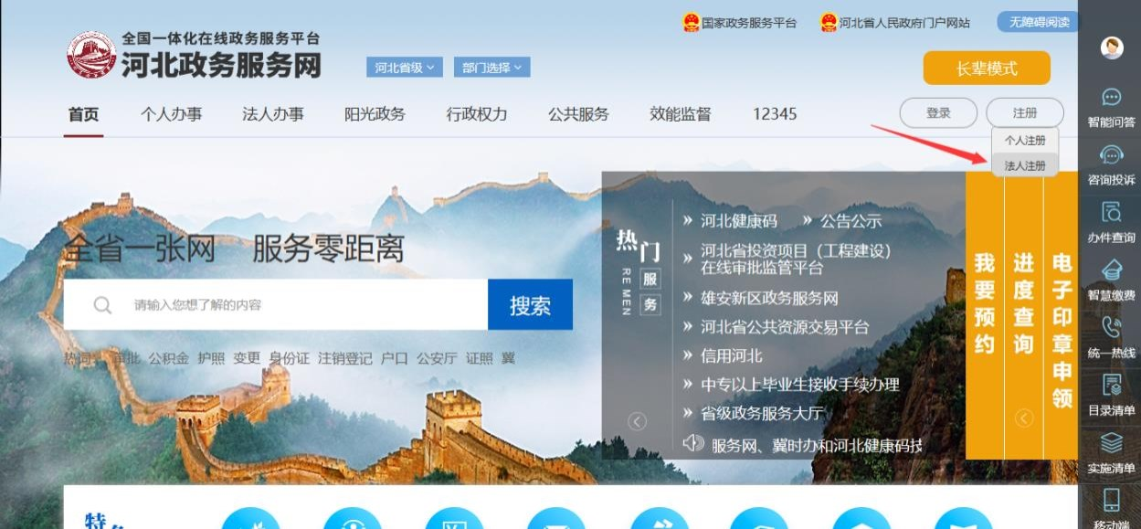 企業(yè)經(jīng)辦人登錄河北政務服務網(wǎng)(http://www.hbzwfw.gov.cn/),點擊下圖注冊按鈕,選擇“法人注冊”入口,按照“我是經(jīng)辦人”注冊流程進行經(jīng)辦人注冊,具體操作可根據(jù)經(jīng)辦人注冊指導視頻完成
