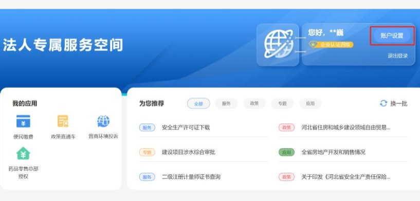 ①通過法人賬戶登錄系統(tǒng)進入法人專屬服務空間,點擊”賬戶設置”,進行經(jīng)辦人授權(quán)管理