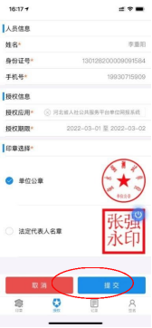 l在印章授權(quán)頁面選擇待授權(quán)人員信息和應用信息(社保網(wǎng)報請選擇“河北省人社公共服務平臺單位網(wǎng)報系統(tǒng)”)以及待授權(quán)的印章,點擊“提交”。
