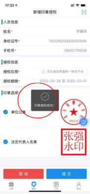 l提示“印章授權(quán)成功”,經(jīng)辦人登錄冀時辦APP 即可進行電子印章操作。