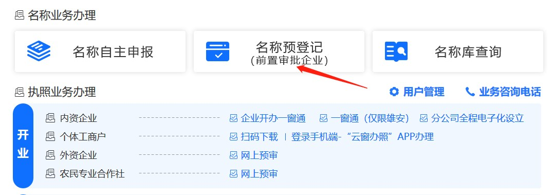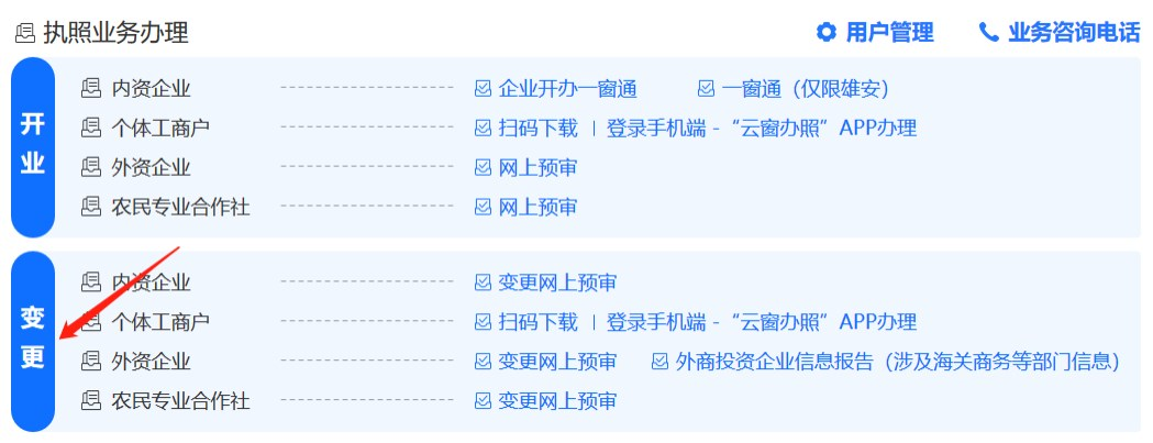 (2)提交成功后,退出名稱自主申報系統(tǒng),進入【執(zhí)照業(yè)務辦理】,按照企業(yè)類型選擇變更業(yè)務系統(tǒng),進入系統(tǒng)按照進行名稱變更。