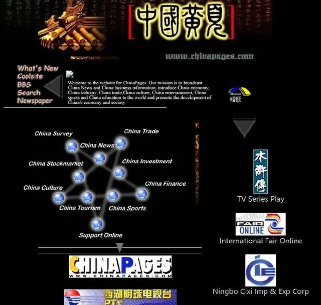 下圖就是網(wǎng)站在1997年時(shí)候的樣子,再早的版本據(jù)說是一張中國(guó)地圖。在1997年的這個(gè)網(wǎng)站上,首頁設(shè)計(jì)運(yùn)用了一些中國(guó)元素,包括琉璃瓦頂以及篆體書寫的“中國(guó)黃頁”??梢钥吹?,它是一個(gè)英文網(wǎng)站,主要面向海外網(wǎng)友。根據(jù)英文介紹,網(wǎng)站的主要目的是“傳播中國(guó)新聞和中國(guó)商業(yè)信息,介紹中國(guó)企業(yè)、中國(guó)工業(yè)、中國(guó)貿(mào)易、中國(guó)文化……”(好多個(gè)Chinese)。在這個(gè)頁面當(dāng)中,我們又一次看到馬云的武俠情結(jié),在右側(cè)有一個(gè)“水滸傳”的欄目,其實(shí)就是相關(guān)企業(yè)名錄,排在首頁位置應(yīng)該要比較多的廣告費(fèi)吧。