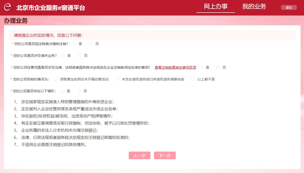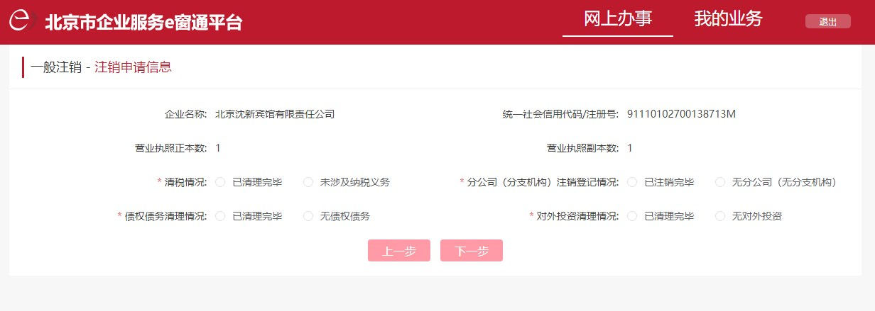完成后點擊【下一步】按鈕,系統(tǒng)會依據(jù)回答情況,判斷當前主體辦理注銷登記業(yè)務的適用途徑。如:一般注銷、簡易注銷、人民法院依法予以解散,公司被依宣告破產等。