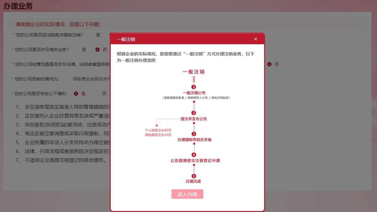 此時點擊【進入辦理】按鈕,開始主體一般注銷登記申請業(yè)務。