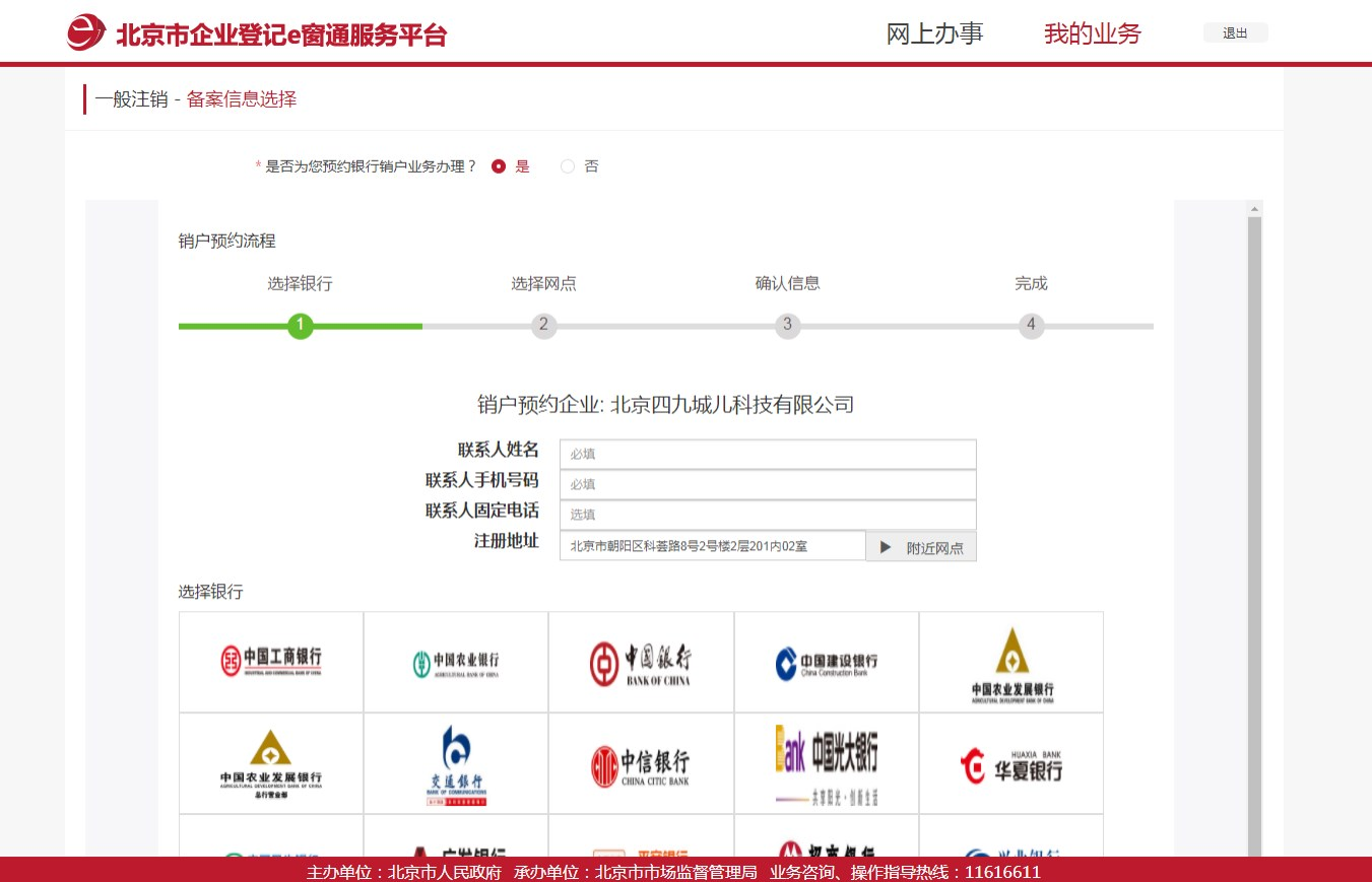 e 窗通同時為您提供銀行預約銷戶業(yè)務,您可以直接在申請主體注銷的同時預約銀行銷戶。無需預約可選擇否后,直接點擊【下一步】。