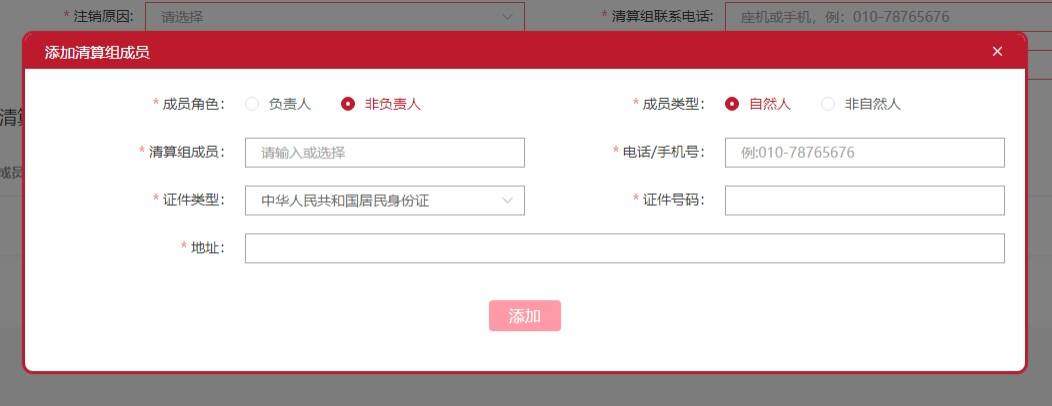 錄入清算組成員信息時,點擊右側圖標,進入添加清算組成員頁面。目前先選擇成員角色,分為負責人和非負責人兩種。