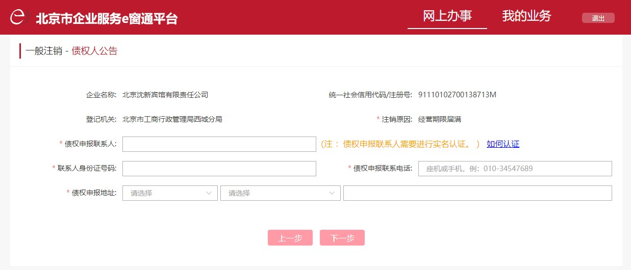 接下來,填寫債權人公告(注意債權申報聯(lián)系人必須做身份確認)。