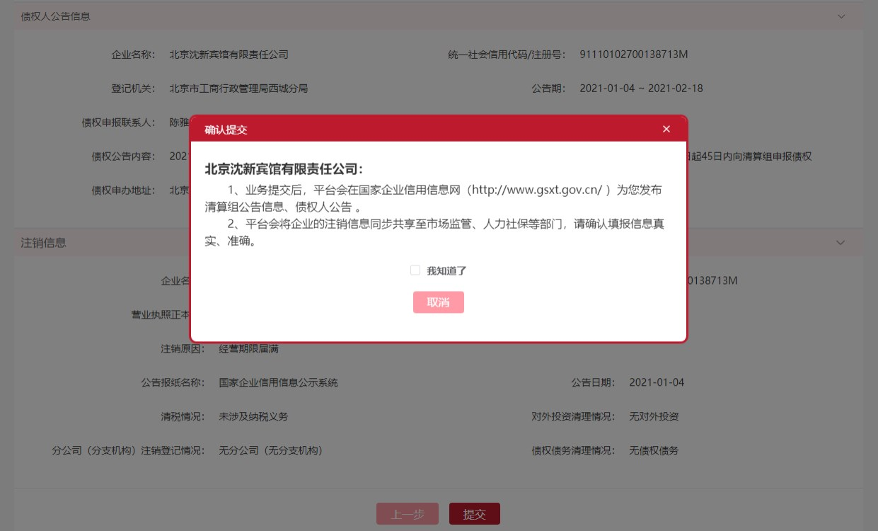 完成后進入一般注銷預覽頁面,當您確認所填信息無誤后可以進行提交操作。