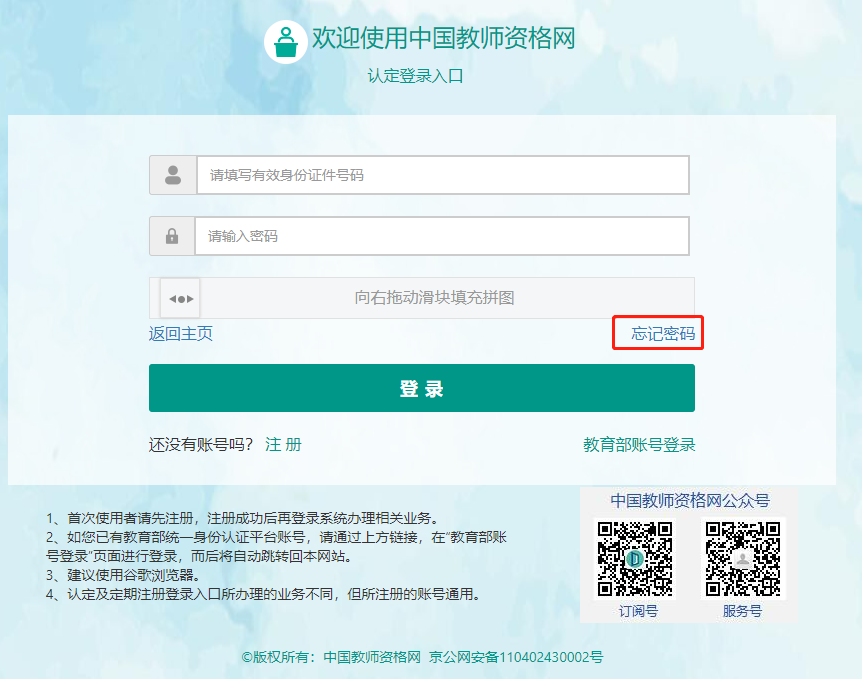 建議您通過微信掃碼關(guān)注中國教師資格網(wǎng)服務(wù)號(hào),并與本系統(tǒng)賬號(hào)綁定,以便于忘記密碼時(shí)進(jìn)行密碼重置。