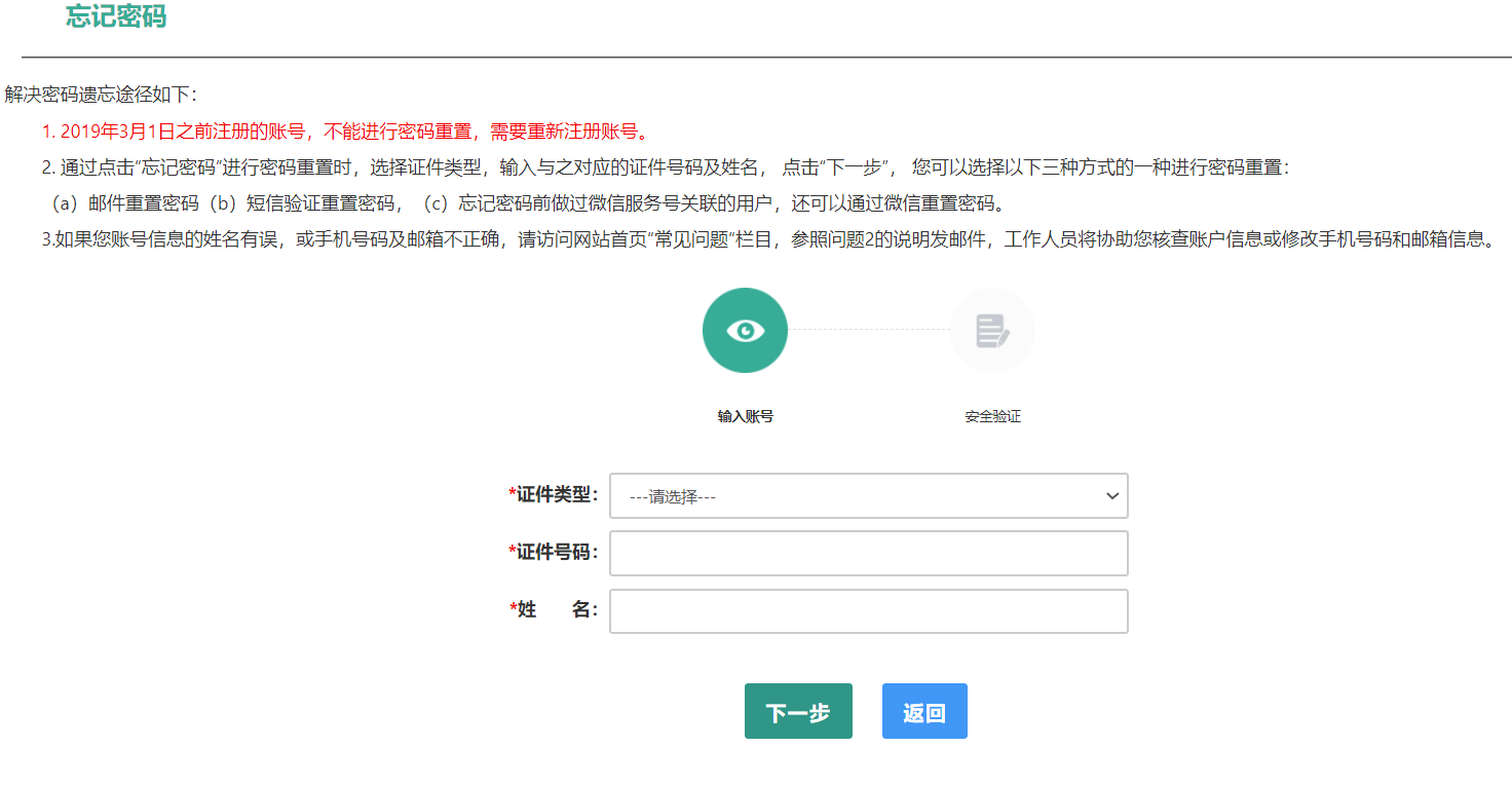 選擇該賬號(hào)在系統(tǒng)中注冊(cè)時(shí)所選的證件類型,輸入對(duì)應(yīng)的證件號(hào)碼及姓名(任何一項(xiàng)選擇或填寫錯(cuò)誤,都無法找回密碼),點(diǎn)擊【下一步】按鈕,共有三種密碼重置方式: