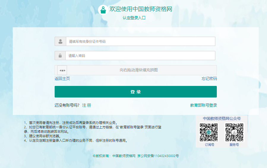 申請(qǐng)人登錄中國教師資格網(wǎng)(http://www.jszg.edu.cn),將看到中國教師資格網(wǎng)首頁如下圖。因各瀏覽器兼容適配問題,建議您使用谷歌瀏覽器或360安全瀏覽器極速模式進(jìn)行后續(xù)操作。