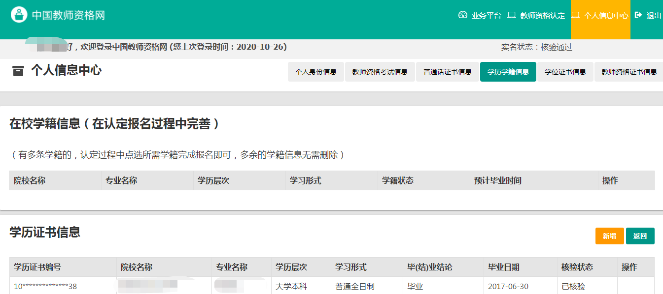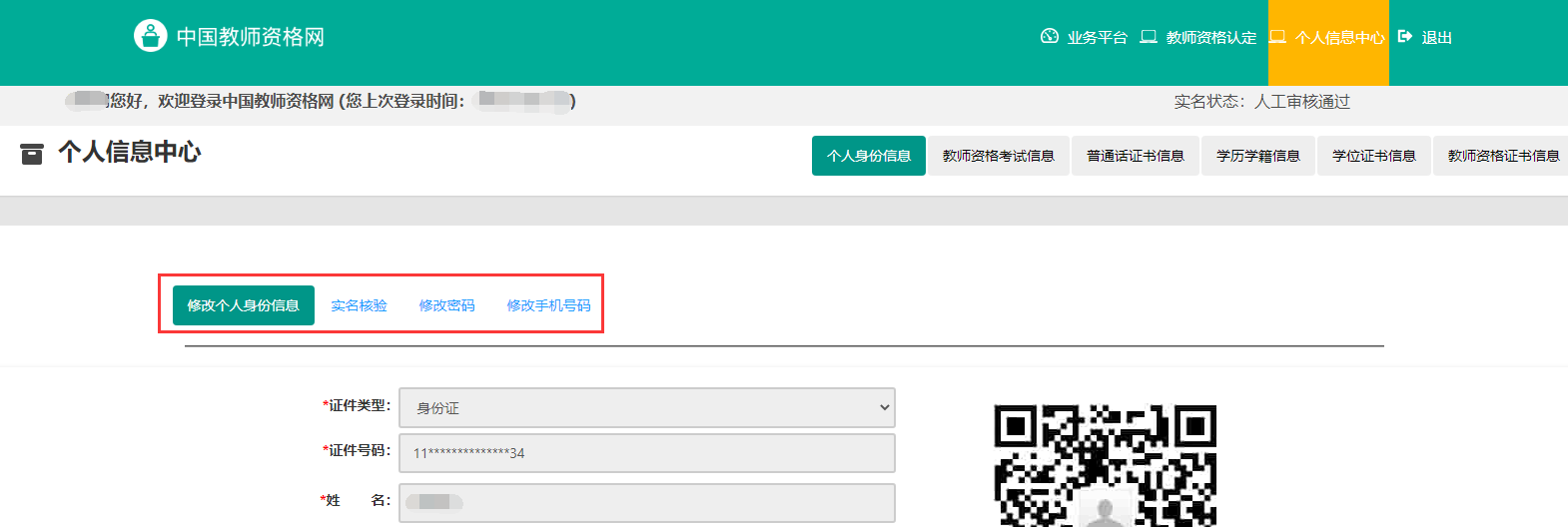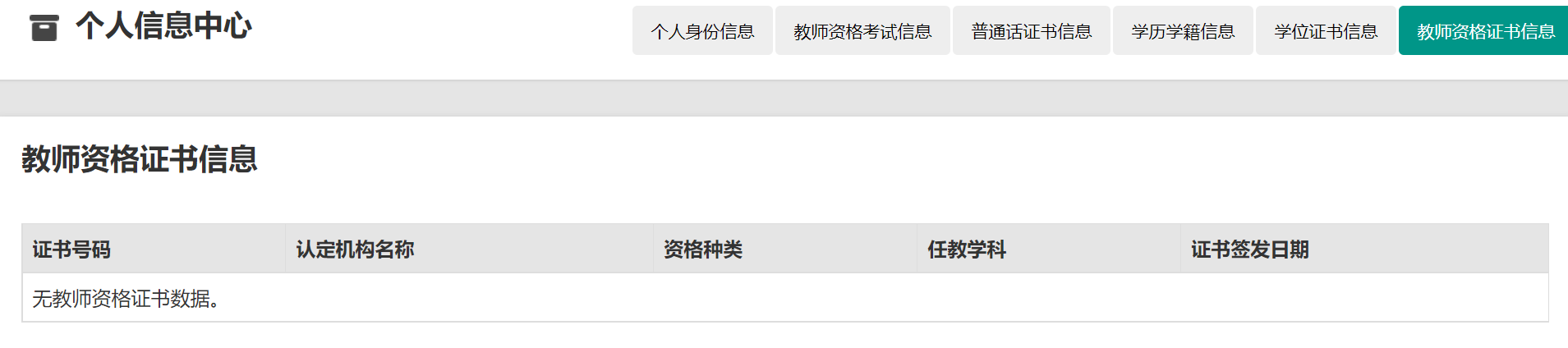 個(gè)人信息中心共有七個(gè)模塊:個(gè)人身份信息、教師資格考試信息、普通話證書信息、學(xué)歷學(xué)籍信息、學(xué)位證書信息、教師資格證書信息、其他證書信息。
