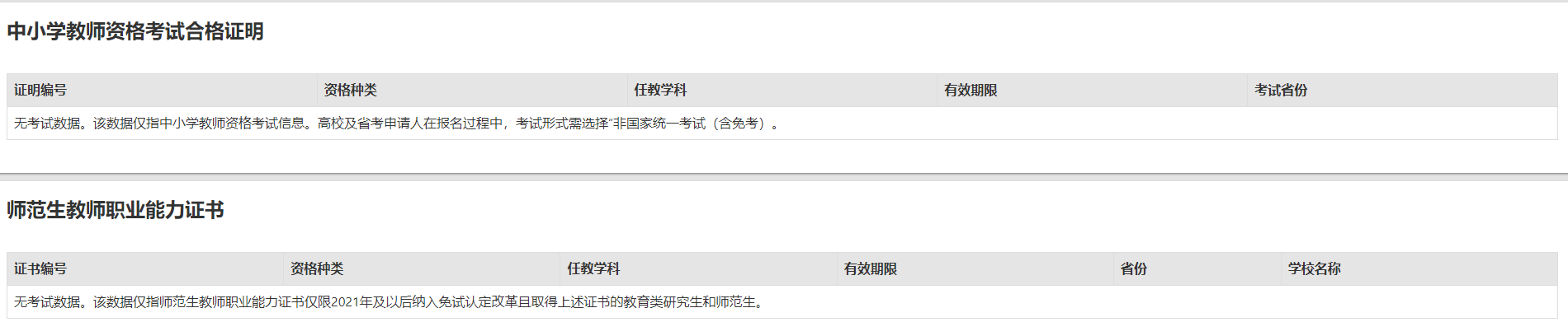 師范生教師職業(yè)能力證書:只有2021年及以后實(shí)施免試認(rèn)定改革的高等學(xué)校,且考核合格并取得《師范生教師職業(yè)能力證書》的教育類研究生和師范生,才會(huì)自動(dòng)同步該證書上的相關(guān)信息。