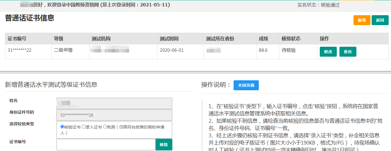 ②錄入證書:僅限2007年之前的普通話證書或無法核驗(yàn)通過的證書。補(bǔ)全相關(guān)信息(普通話信息分?jǐn)?shù)欄必須填寫數(shù)字)后,需攜帶證書原件至現(xiàn)場(chǎng)確認(rèn)時(shí)人工核驗(yàn)。核驗(yàn)狀態(tài)指系統(tǒng)核驗(yàn)狀態(tài),人工核驗(yàn)通過不會(huì)更改核驗(yàn)狀態(tài)。