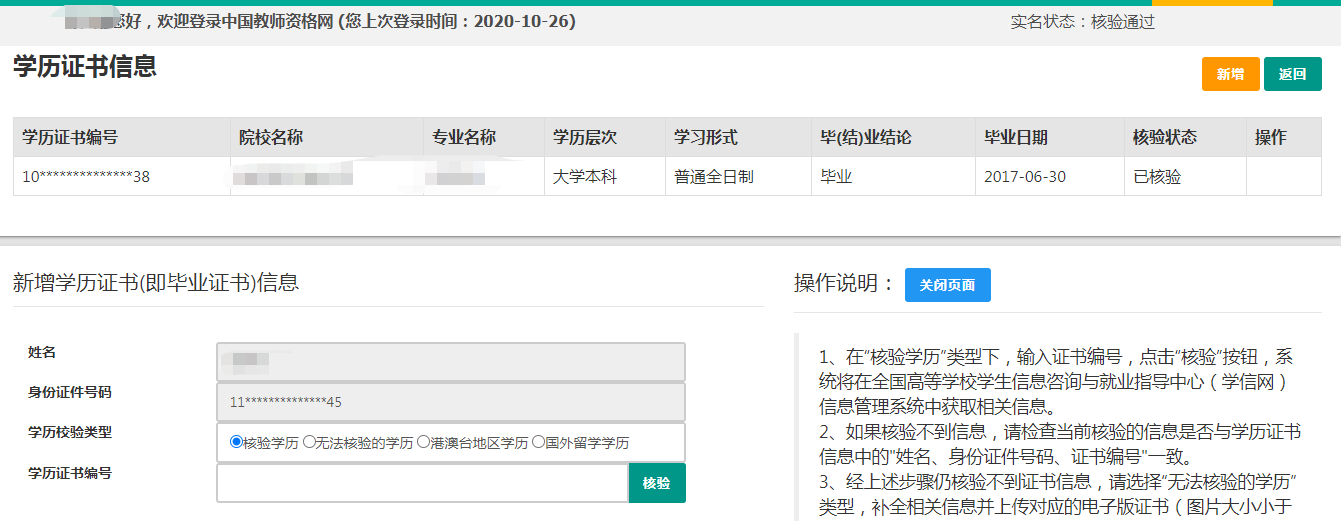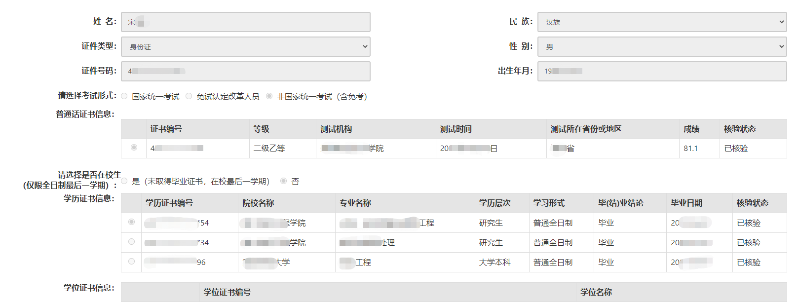 學(xué)歷證書信息:根據(jù)申請(qǐng)人所取得的學(xué)歷證書選擇學(xué)歷的校驗(yàn)類型。