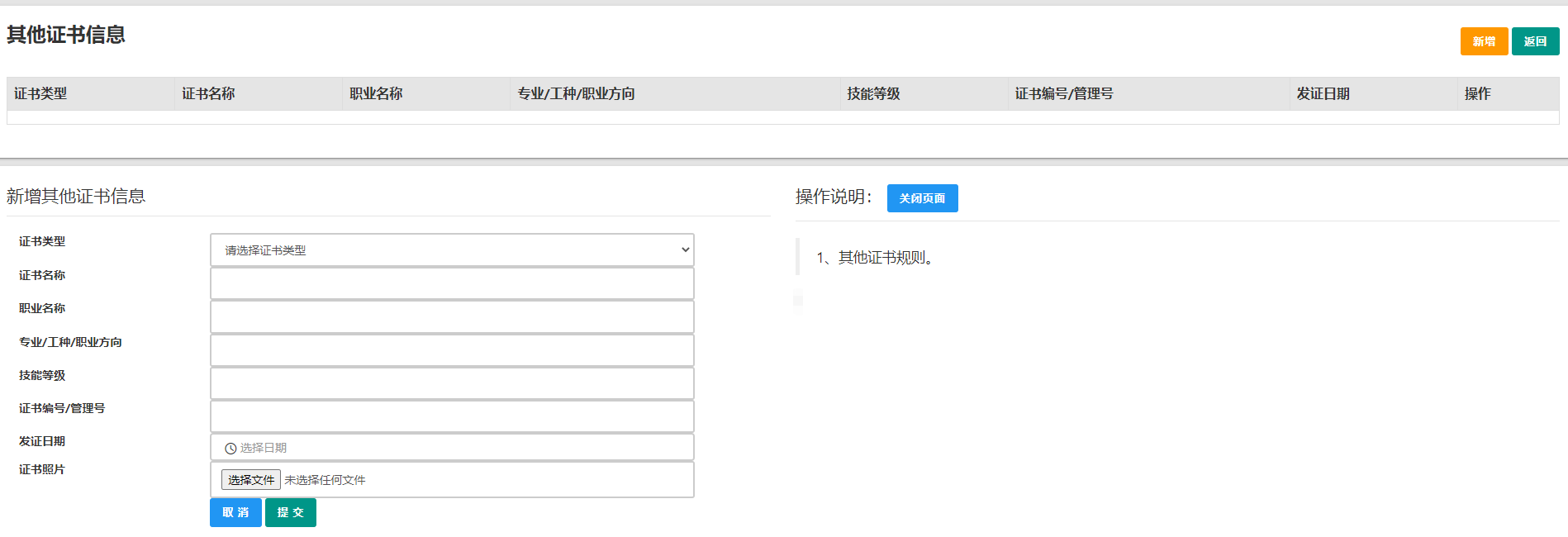 本功能僅適用于申請(qǐng)中等職業(yè)學(xué)校實(shí)習(xí)指導(dǎo)教師資格時(shí),需要用到的其他職業(yè)技能等級(jí)證書的信息維護(hù),由申請(qǐng)人按照右側(cè)操作說明自行新增并填寫證書信息及上傳證書詳情頁圖片。