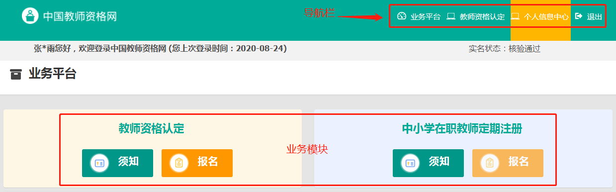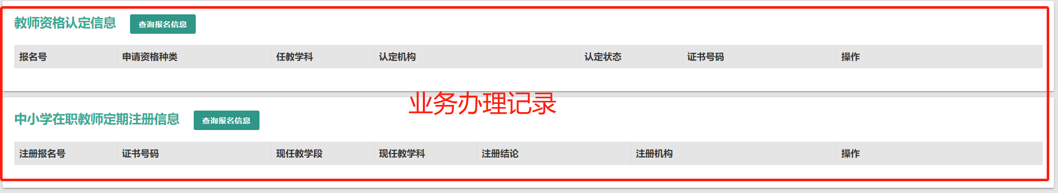 【業(yè)務(wù)平臺(tái)】可以看到兩項(xiàng)業(yè)務(wù)辦理記錄,但從【教師資格認(rèn)定】-【在線辦理】入口進(jìn)入系統(tǒng)不可辦理中小學(xué)教師定期注冊(cè)相關(guān)業(yè)務(wù)。中小學(xué)教師定期注冊(cè)業(yè)務(wù)于每年的下半年開展,請(qǐng)從中國教師資格網(wǎng)導(dǎo)航欄下的定期注冊(cè)【在線辦理】入口進(jìn)入。