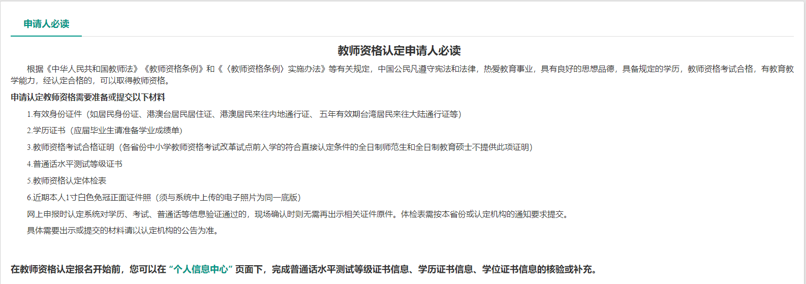 教師資格考試信息:只有參加了國家中小學(xué)教師資格考試且成績合格的申請(qǐng)人,此處才會(huì)自動(dòng)同步考試合格證明上的相關(guān)信息。
